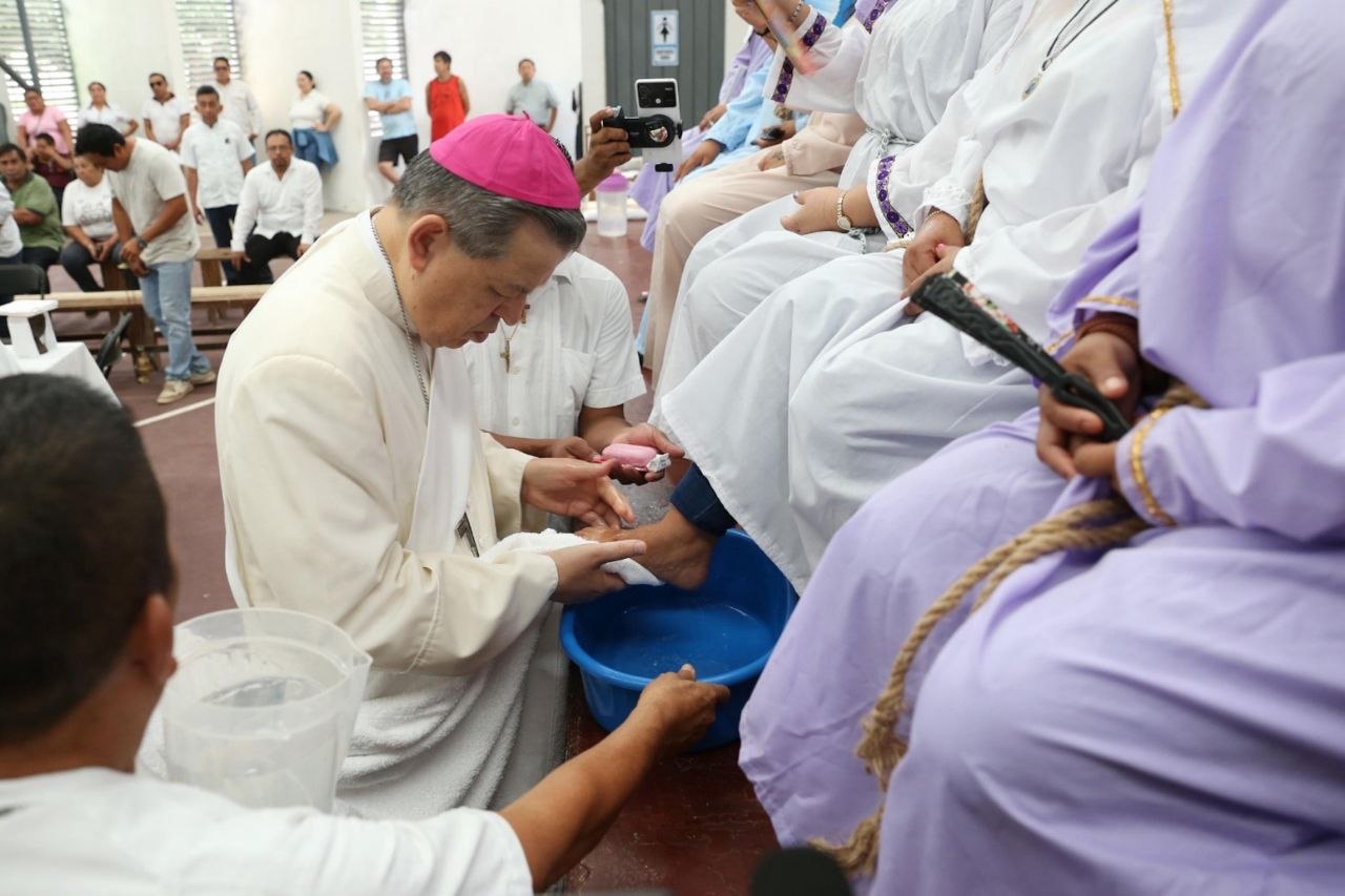 Frente al altar se colocaron seis mujeres y seis hombres, vestidos con túnicas de colores, quienes cumplen diversas sentencias y fueron seleccionados para participar por su buen comportamiento durante su permanencia en el centro. En el momento central de la ceremonia, el arzobispo se ciñó una toalla a la cintura y, con agua y jabón, lavó uno a uno los pies de las 12 personas participantes.