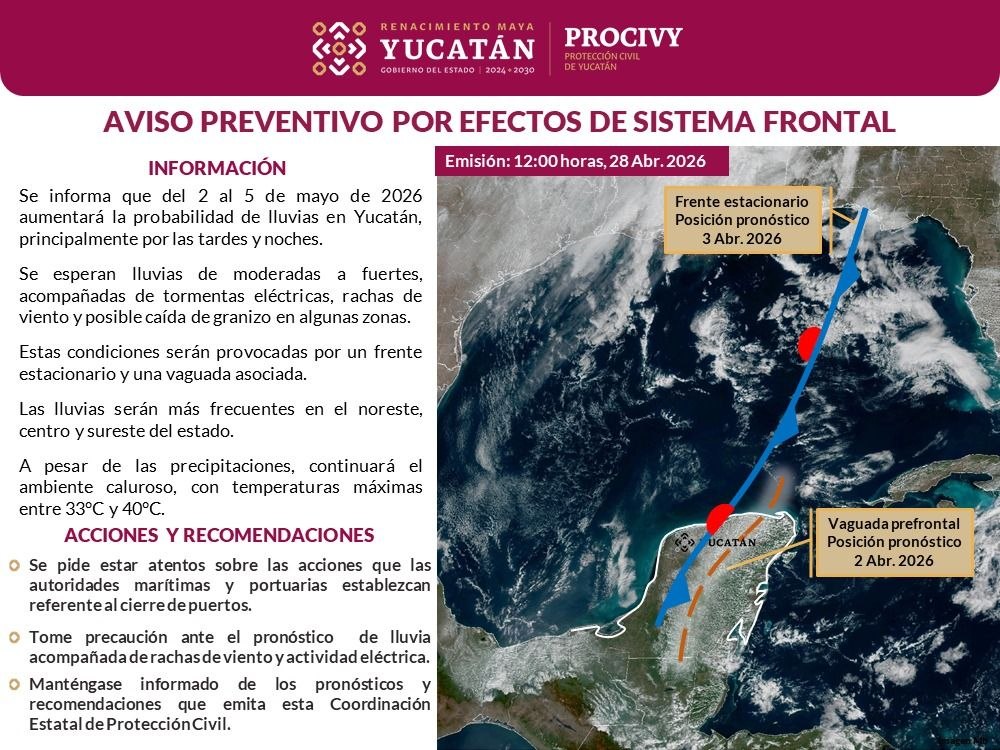 El Gobierno del Estado, a través de la Coordinación Estatal de Protección Civil (Procivy), informa a la población que, desde el sábado 2 y hasta el martes 5 de mayo, se espera un incremento significativo en el potencial de lluvias sobre Yucatán, con intensidad variable, principalmente durante las tardes y noches.