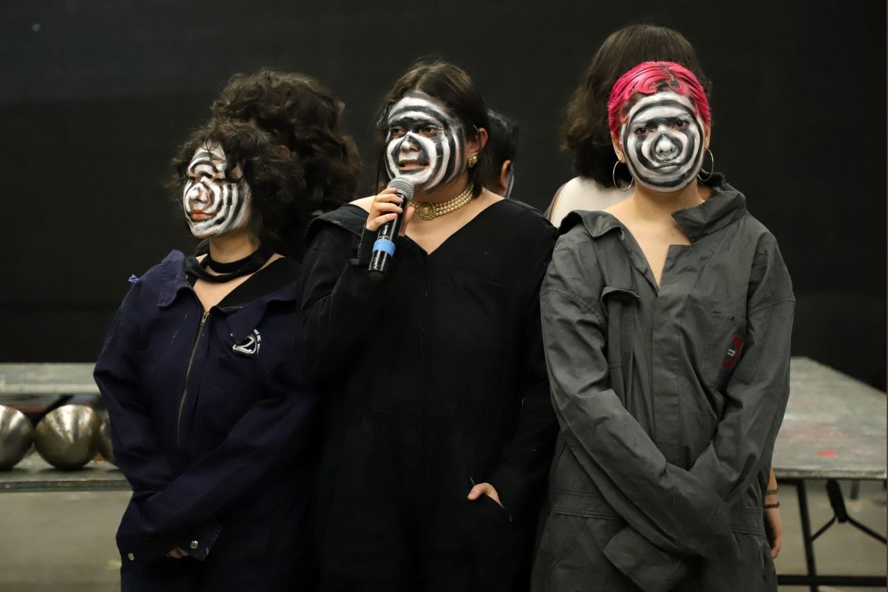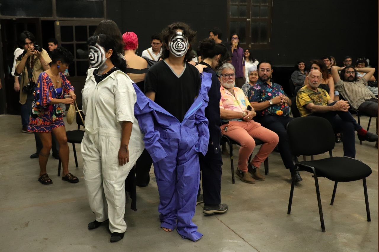 La secretaria de la Cultura y las Artes de Yucatán, Patricia Martín Briceño, y la jefa de Artes Visuales de la Sedeculta, Débora Carnevali, acompañadas por las y los performers, dieron la bienvenida al público a una función que se tornó ruidosa, colectiva y caótica, rasgos característicos del estridentismo en México.