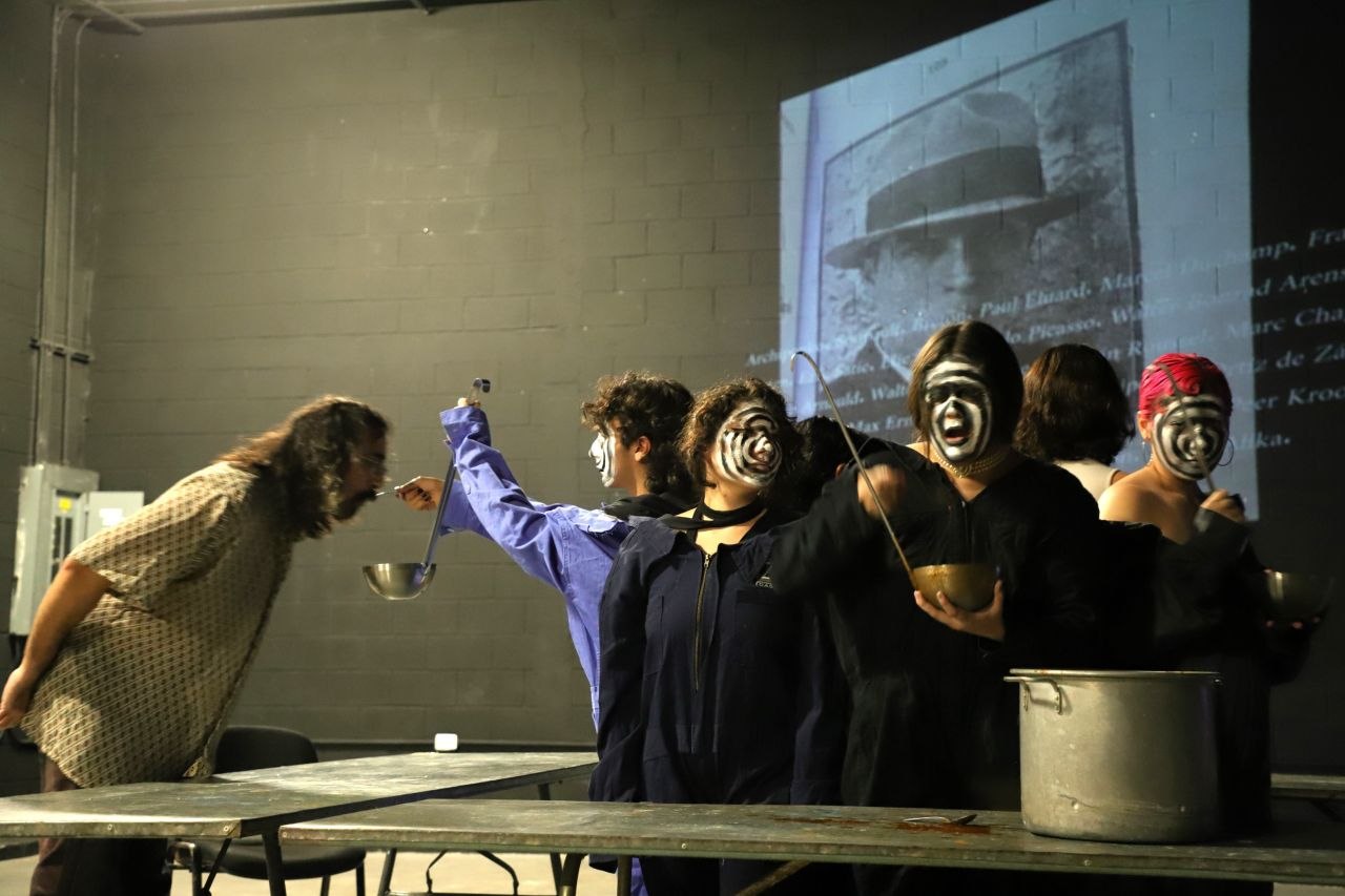 Mientras las y los intérpretes cocinaban, detrás de ellos se proyectaban imágenes del estridentismo en distintos idiomas, lo que introduce una dimensión adicional al acto escénico: la traducción y circulación de una vanguardia local. Este recurso amplía su alcance y rompe con la idea de una sola narrativa cultural.