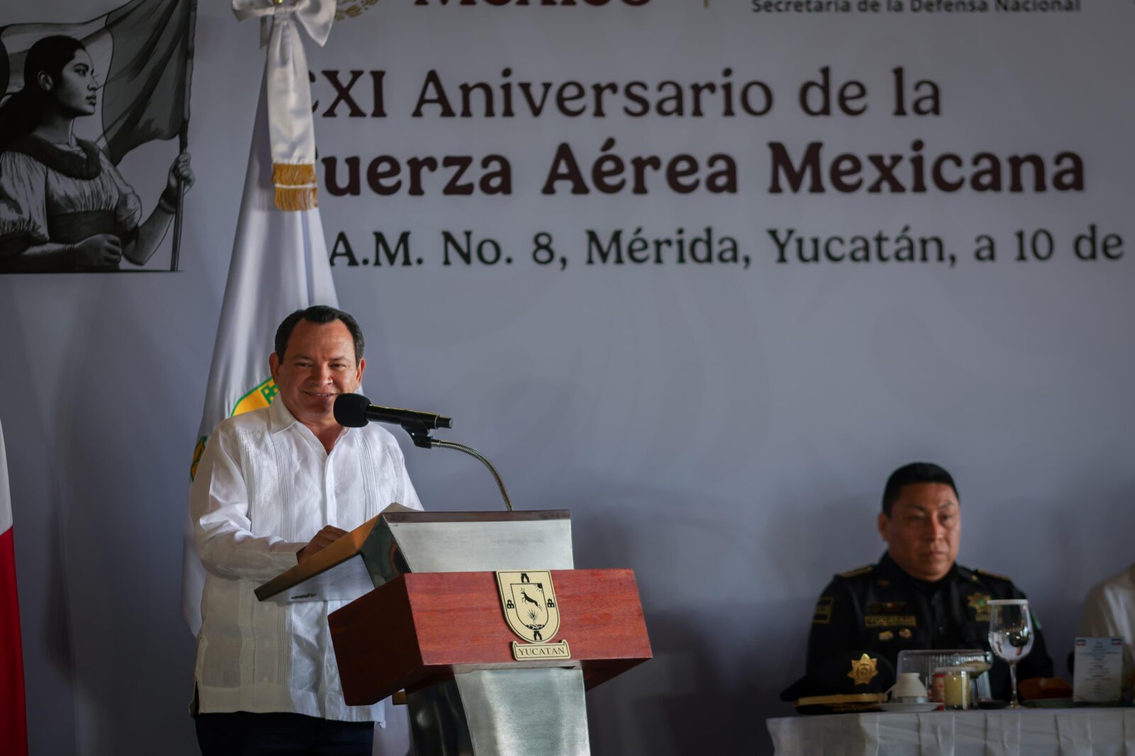 El Gobernador Joaquín Díaz Mena presidió la conmemoración del CXI aniversario de la Fuerza Aérea Mexicana, realizada en la Base Aérea Militar número 8, donde reconoció la labor, el profesionalismo y la coordinación de esta institución en favor de la seguridad, la paz y la atención a emergencias en Yucatán y en el país.
