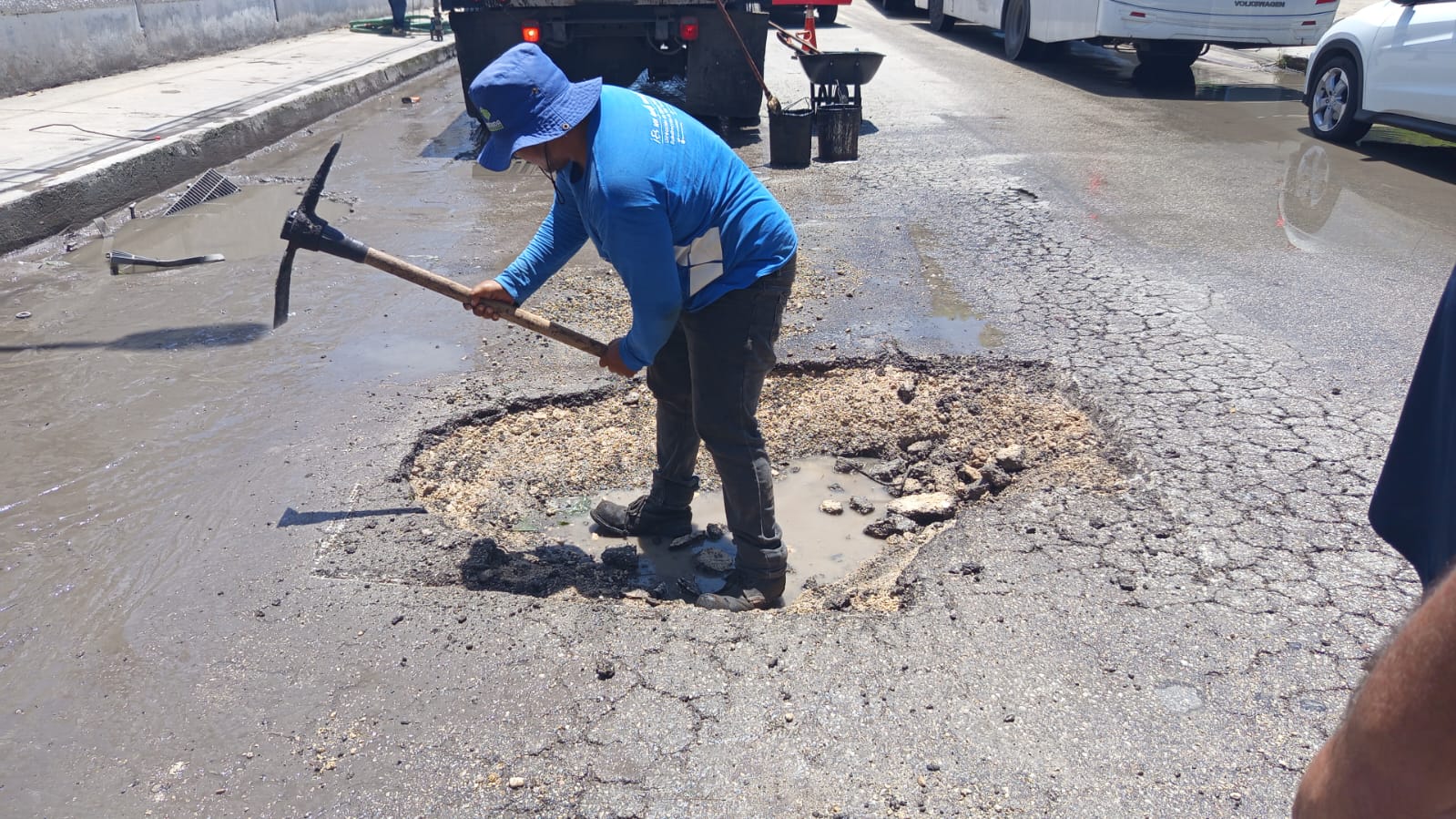 Rápida intervención de bacheo del Ayuntamiento de Mérida en la colonia Nueva Sambulá.