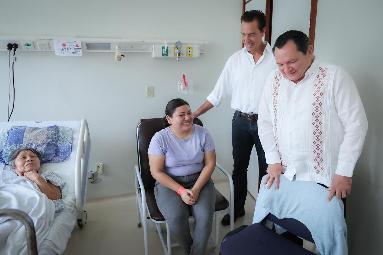 Durante el recorrido, el titular del Ejecutivo estatal platicó con Yolanda Cua Chalé, quien acompaña a su madre, Perpetua Chalé y Chim, durante su recuperación tras una cirugía de hernia, y reconoció la mejoría que representan estas sillas cama para los familiares que pasan las noches en vela al cuidado de sus pacientes.