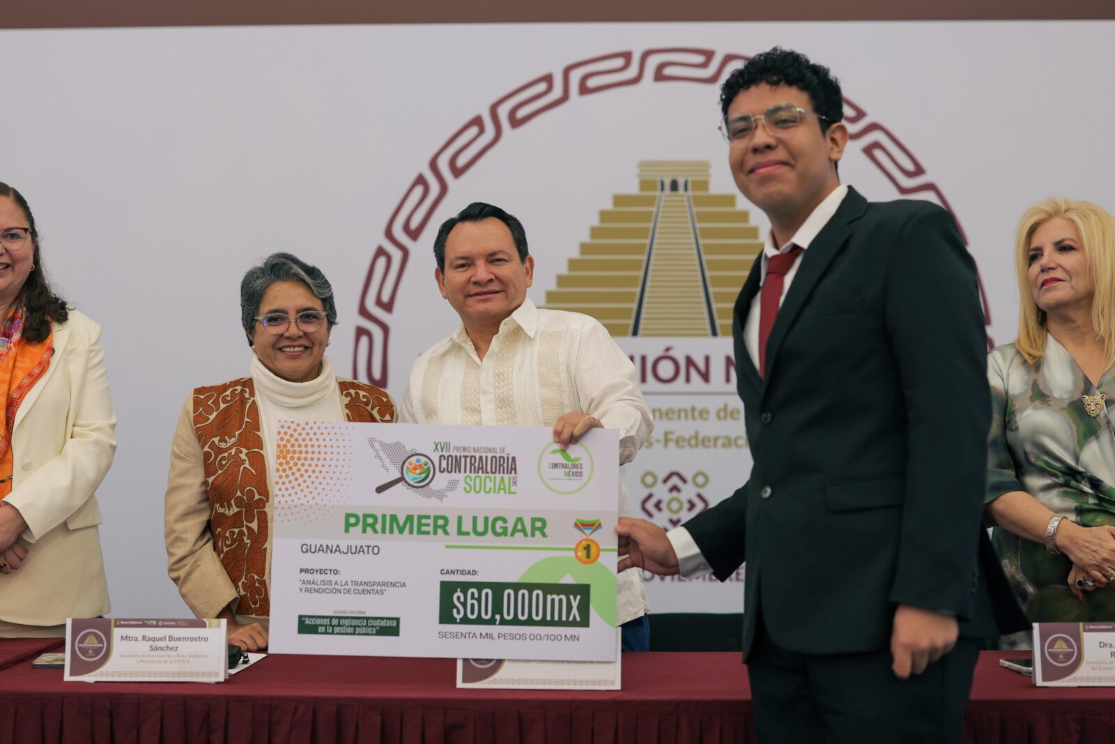 Acompañado de la Secretaria de Anticorrupción y Buen Gobierno (SABG) del Gobierno de México, Raquel Buenrostro Sánchez, el mandatario encabezó la entrega de reconocimientos del XX Concurso Nacional Transparencia en Corto 2025 y del XVII Premio Nacional de Contraloría, donde 12 personas fueron distinguidas por su contribución a la vigilancia ciudadana, la participación social y la legalidad en el servicio público.