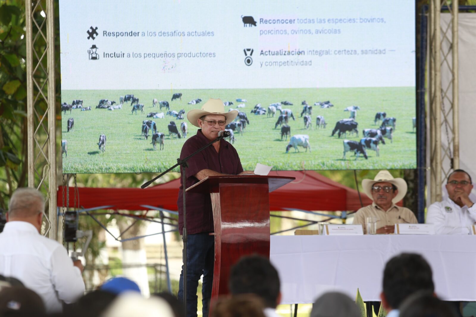 En el evento, el Secretario de Desarrollo Rural de Yucatán, Edgardo Rodríguez Medina, afirmó que hoy el campo y la ganadería enfrentan nuevos retos y oportunidades y esta reforma busca adaptar las necesidades ganaderas con tres puntos principales: la modernización y competitividad, la sustentabilidad ambiental y el fortalecimiento económico del sector con acciones como la asignación de presupuestos progresivos y un marco legal que dé certeza y sustentabilidad a la ganadería yucateca.