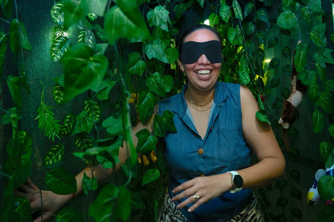 Ubicado en la Nave del Gobierno del Estado, el stand ofrece de forma gratuita, un recorrido inmersivo a través de distintos escenarios guiados por la voz de los aluxes Yaku y Kanán, personajes aliados que acompañan a las y los visitantes a descubrir, desde la oscuridad, cómo se percibe el mundo con otros sentidos: el tacto, el oído y el olfato.