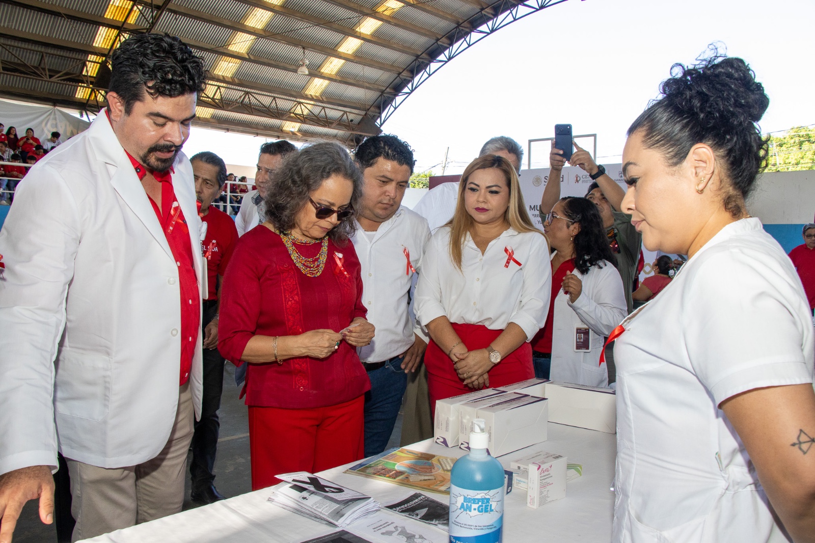 Posteriormente, la titular de la SSY recorrió la feria de la salud instalada en el Gimnasio Polifuncional, donde organizaciones e instituciones de salud realizaron acciones de información y fomento preventivo en torno al VIH y el Sida.