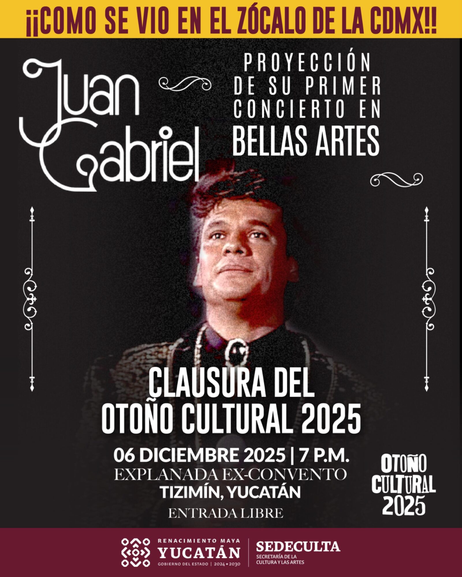 La voz de Juan Gabriel volverá a sonar en Tizimín, como lo hizo hace 25 años en el Palacio de Bellas Artes, con la proyección de ese histórico concierto como clausura del Otoño Cultural 2025, en una función que se llevará a cabo el próximo día 6, a las 19:00 horas, en la explanada del Ex Convento de la localidad, con acceso gratuito.