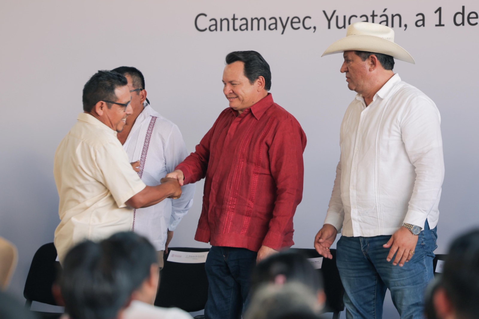 En presencia del titular de la Secretaría de Desarrollo Rural, Edgardo Medina Rodríguez, el Gobernador explicó que en Cantamayec se entregan recursos para la construcción de 29 kilómetros de caminos sacacosechas, gracias a una inversión de dos millones 320 mil pesos, en beneficio de 14 comités integrados por 140 personas productoras.
