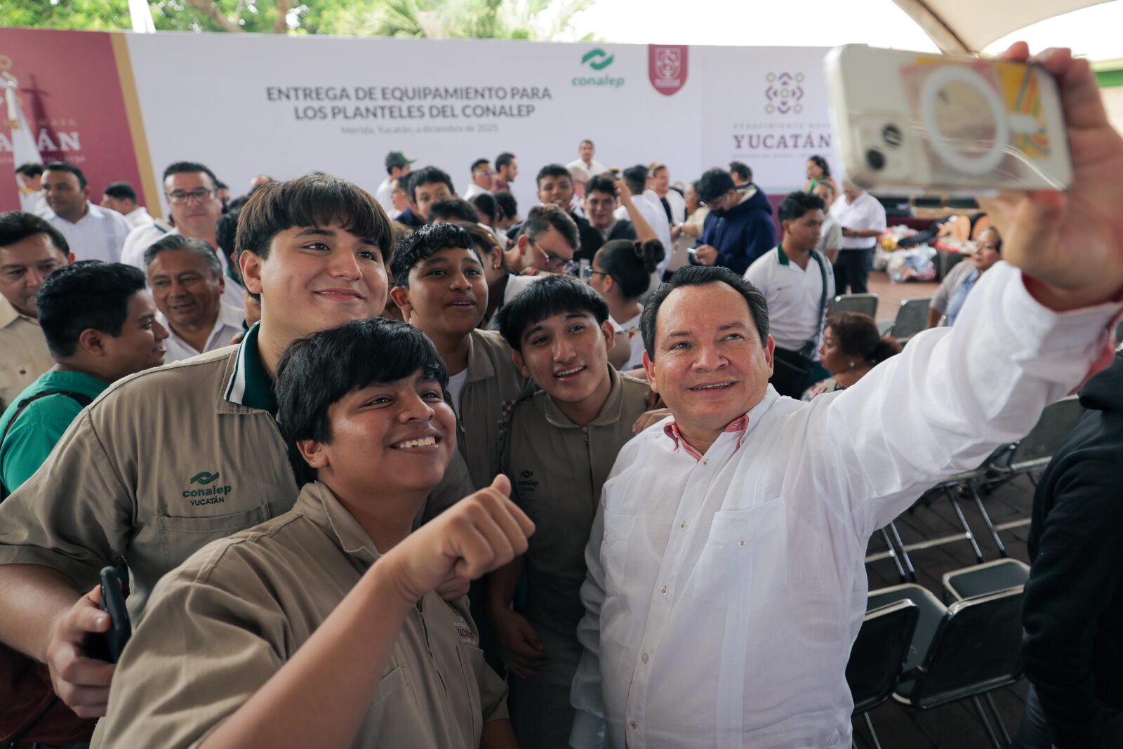 El Renacimiento Maya fortalece la infraestructura y el equipamiento del Colegio Nacional de Educación Profesional Técnica (Conalep) de Yucatán con la entrega de equipos de cómputo, aires acondicionados, mobiliario, material deportivo, instrumentos musicales y herramientas de trabajo, a fin de mejorar las condiciones de aprendizaje y dignificar los espacios de formación académica.