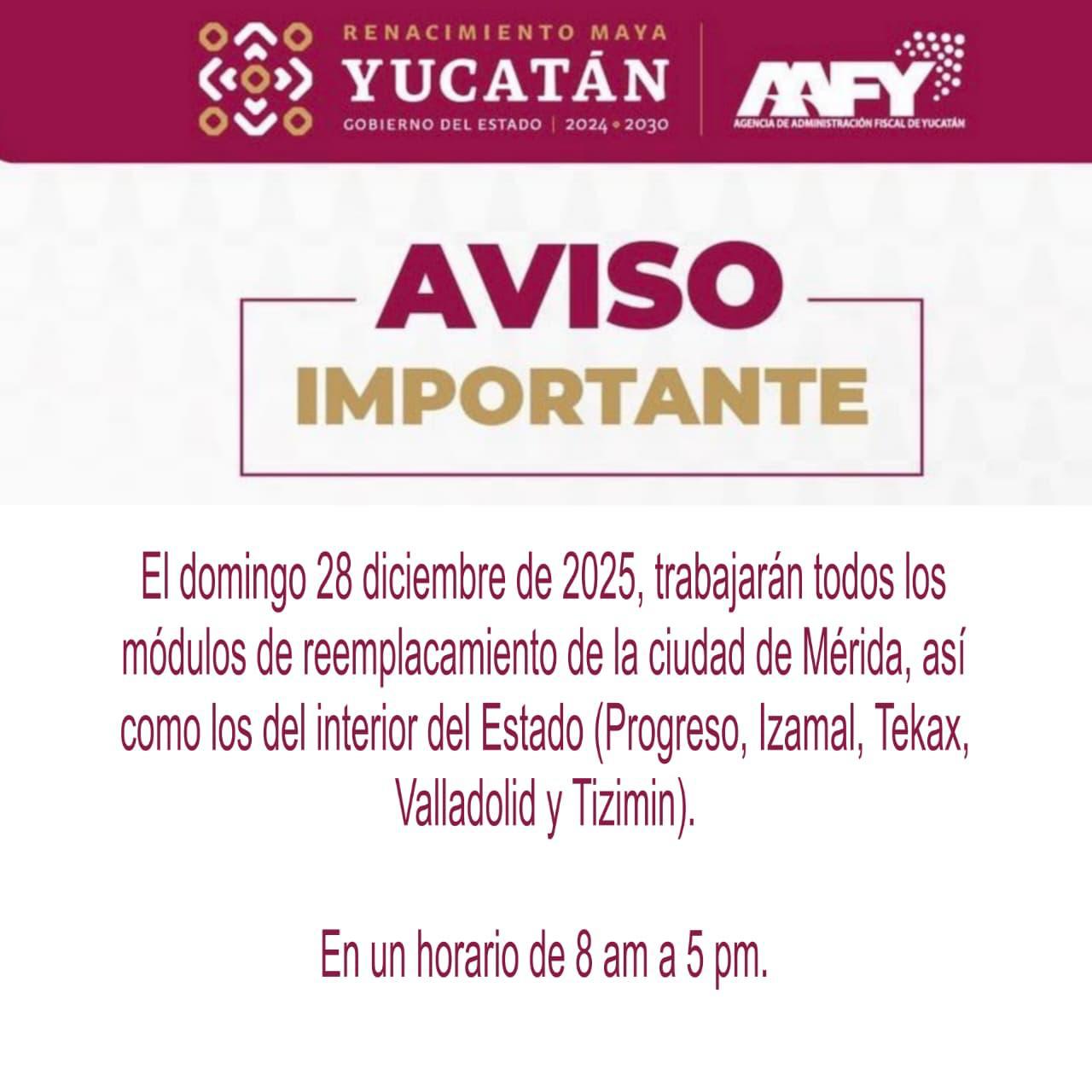 Habrá atención dominical en módulos de control vehicular para el trámite de reemplacamiento en Mérida, Progreso, Izamal, Tekax Valladolid y Tizimín