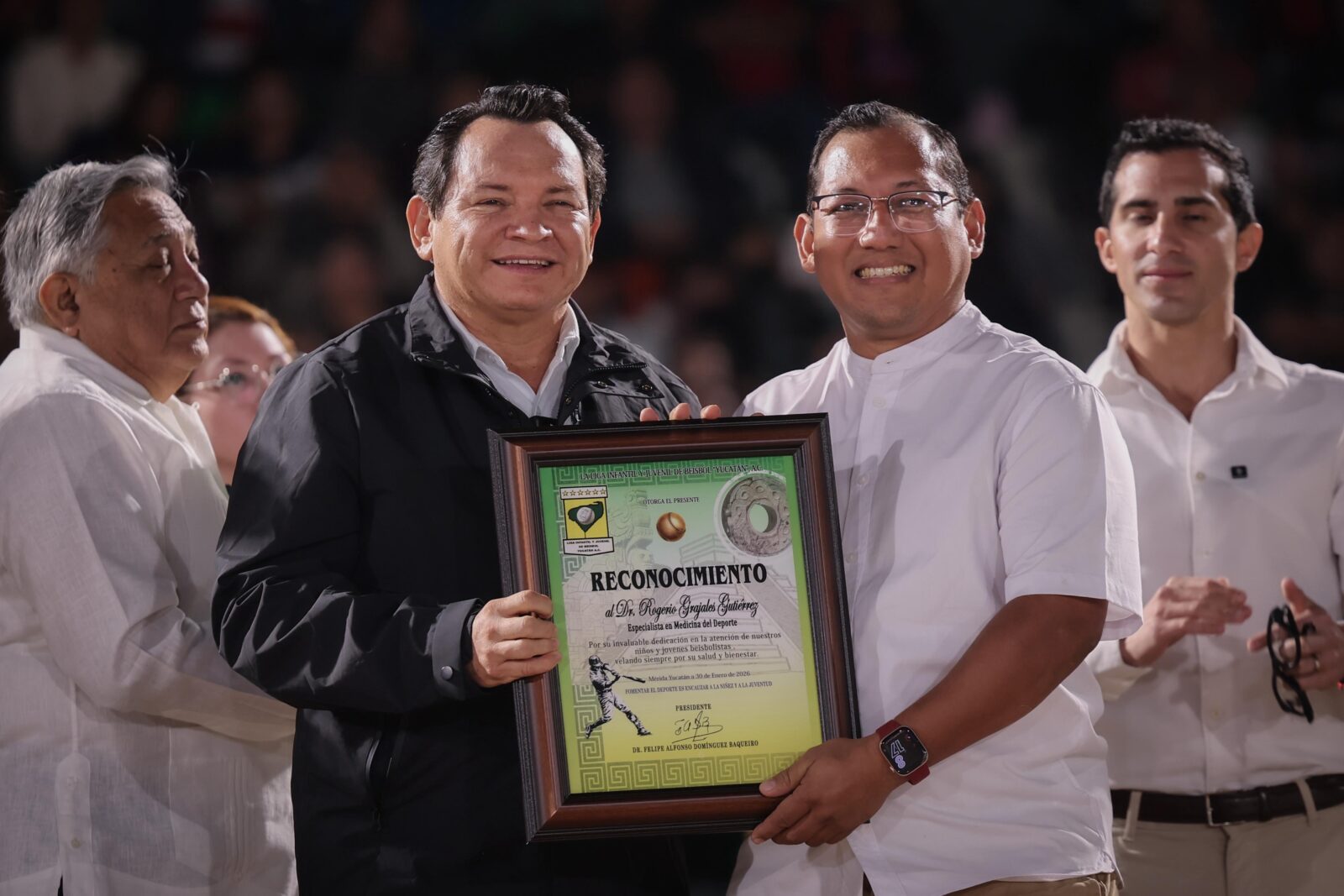Con motivo de esta jornada, el Gobernador entregó reconocimientos al especialista en Medicina Deportiva, Rogerio Grajales Gutiérrez; al doctor en Ciencias y Cultura Física, Omar Solís Briceño; y al especialista en Medicina Deportiva, Víctor Balam de la Vega, por su dedicación en la atención de las y los jóvenes beisbolistas.